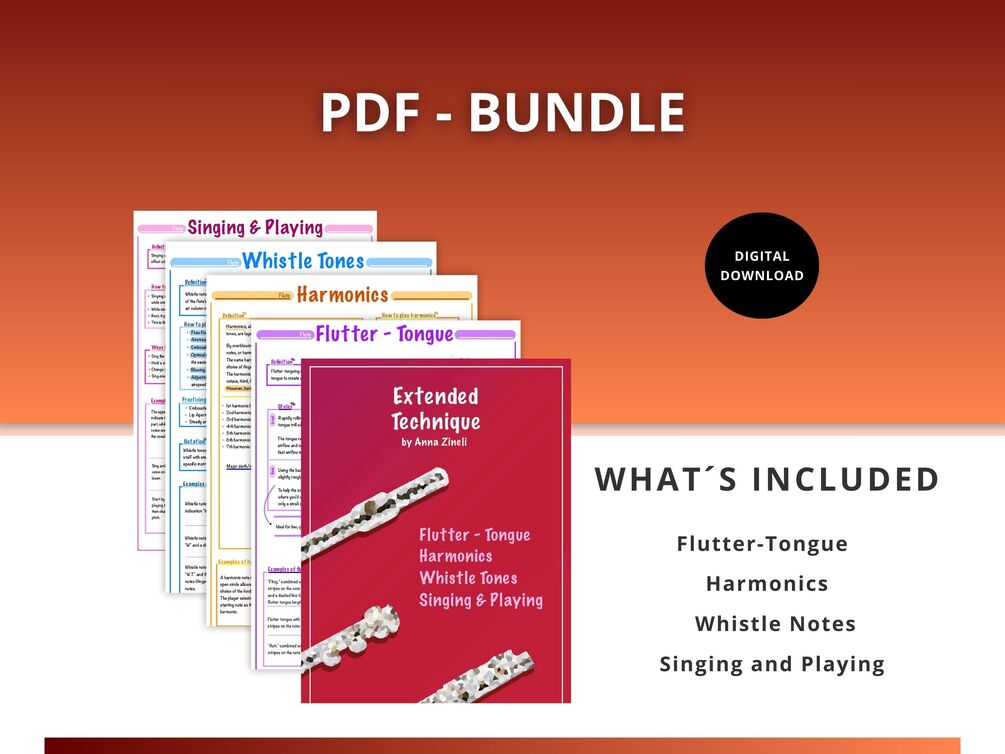 Discover the 'Extended Techniques' digital PDF bundle in A4 size, providing essential knowledge on Flutter-Tongue, Harmonics, Whistle-Tones, and Singing and Playing. Elevate your musical skills with these guides.🎶